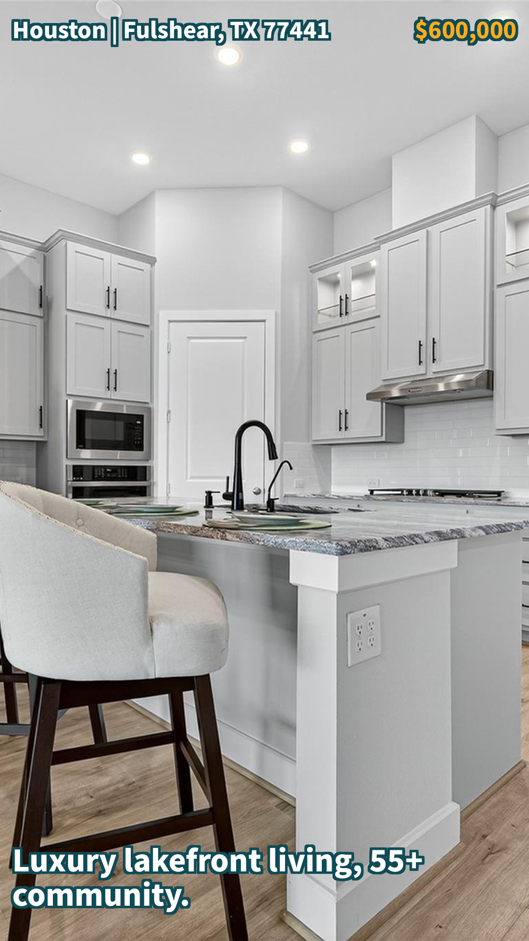 This elegant lakefront home, located in Fulshear, TX 77441, is listed for sale at $600,000. Situated in a vibrant 55+ active community, this single-family residence was built in 2022 and offers 2,621 square feet of living space on an expansive 8,495 square foot lot. The property features 3 to 4 bedrooms and 2.5 bathrooms.