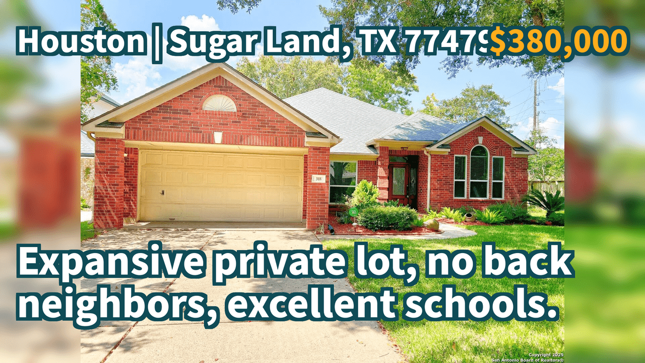 Sugar Land, TX 77479 | $380,000 | 2,416 Sqft, 3 beds, 2 full baths, Single-Family | Expansive private lot, no back neighbors, excellent schools.